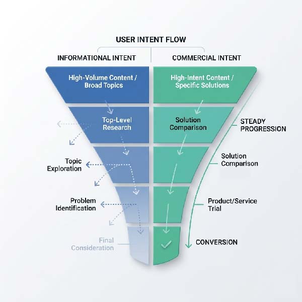 There’s a critical difference between informational intent and commercial intent, and most D2C content teams either don’t know it or don’t act on it. Informational intent is someone researching a topic — they might buy eventually, but not today. Commercial intent is someone who has already decided they want to buy and is choosing between options. These are completely different people at completely different points in their journey.