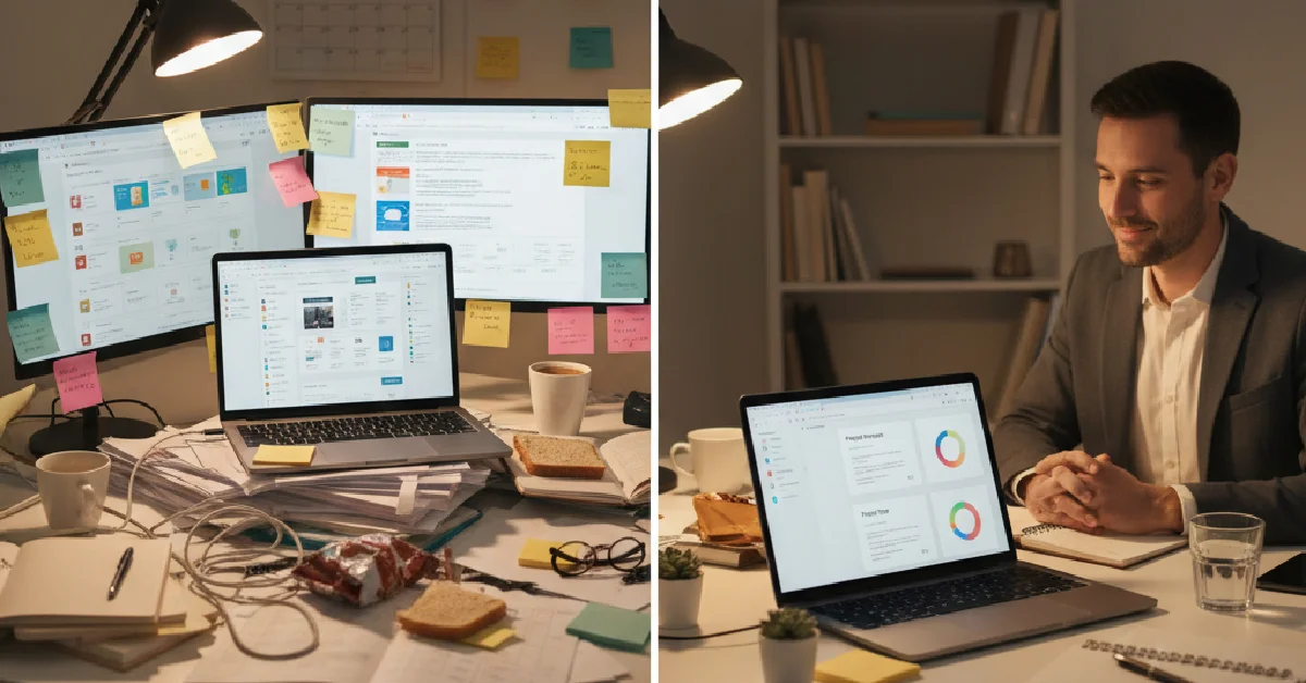 Most solo entrepreneurs collect tools like trading cards – a design app here, a scheduling tool there, random spreadsheets everywhere. Each tool works independently, creating more fragmentation instead of clarity. You’re constantly switching between platforms, manually transferring information, and wondering why productivity feels impossible.